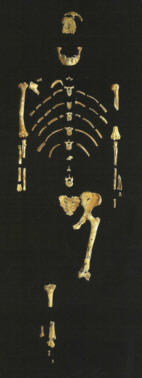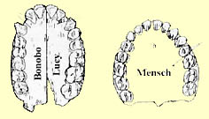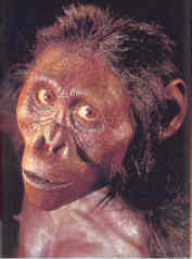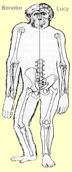 Lucy wurde 1974 von Don Johansen und seinem Team in der äthiopischen Hadar-Region gefunden. Bis auf den Schädel war das Skelett fast vollständig erhalten und wurde auf 3,3 Millionen Jahre datiert. Zur Zeit der Grabungen war gerade der Beatles - Song "Lucy in the sky with diamonds"aktuell. In der Annahme, das relativ kleine Skelett sei von einem weiblichen Tier, wurde es Lucy getauft. Bis heute gilt Lucy immer noch als wichtigste fossile Übergangsform zwischen Menschen und Menschenaffen, auch wenn sie von manchen Forschern inzwischen einer Seitenlinie zugeordnet wird. Auf Grund genetischer Unterschiede wird die Aufspaltung zwischen der Menschen- und Schimpansenlinie auf einen Zeitraum vor 5 - 7 Millionen Jahren vermutet. Wissenschaftler erwarteten für die Zeit vor 3 Millionen Jahren einen Mischtyp, der in seinen Merkmalen etwa in der Mitte zwischen heutigem Mensch und Menschenaffe liegt. Überraschenderweise entsprach das Skelett von Lucy nicht genau diesen Erwartungen. Beurteilen Sie selbst: |
