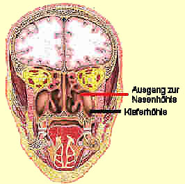 Am häufigsten treten Entzündungen in der Kieferhöhle auf, da sich die Öffnung vorne oben befindet und das Sekret in aufrechter Haltung nur sehr schlecht abfließen kann. Aus diesem Grund nimmt man beim Inhallieren mit schleimlösenden Dämpfen den Kopf nach vorne. Dann befindet sich die Abflussöffnung an der tiefsten Stelle. Das ist für Zweibeiner eigentlich eine Fehlkonstruktion und wahrscheinlich ein Relikt aus vierbeinigen Zeiten. |