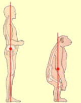 | Schimpansen können nur begrenzt gut aufrecht gehen. Sie können ihre Knie nicht ganz durchdrücken und sie müssen den Oberkörper etwas nach vorne neigen, damit der Schwerpunkt über den Füßen bleibt. Ihr Körper ist besser geeignet zum Hangeln und Klettern in den Bäumen und für eine 4-beinige Fortbewegung auf dem Boden. Viele Unterschiede beim menschlichen Skelett hängen mit der zweibeinigen Fortbewegung zusammen. |
