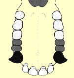 | Notieren Sie Unterschiede zur Form (5.) der Zahnleiste (oval oder hufeisenförmig), Größe der Eckzähne (6.) und zur Zahnlücke (7.) vor den Eckzähnen (Diastema): |